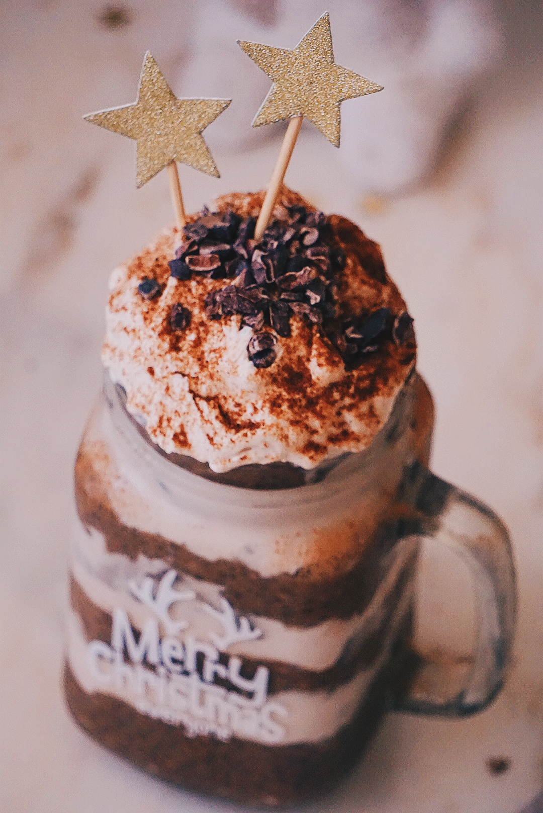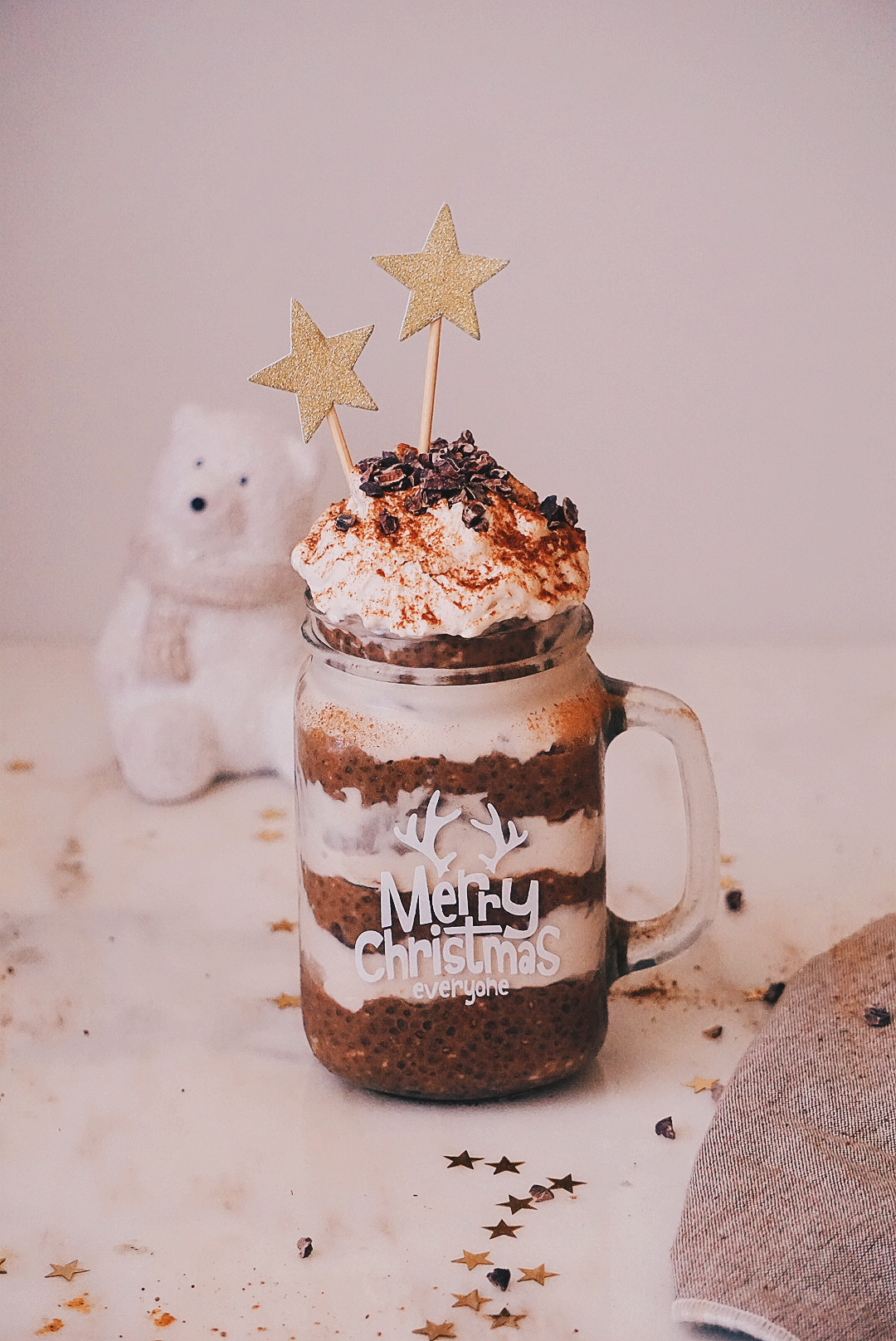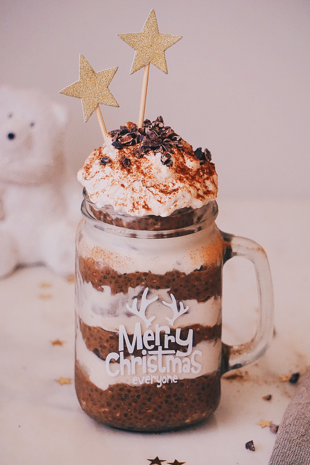 - Quando estiver pronto a ser servido bate o creme de cocô e monta em camadas podes juntar pepitas de cacau cru por cima.