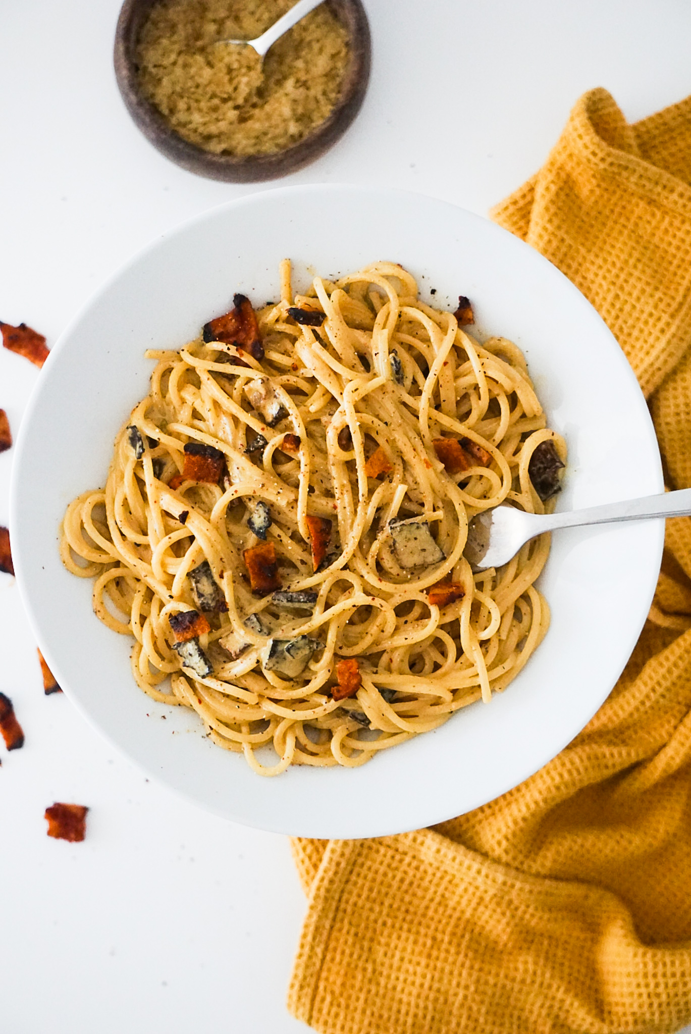 Sabor fumado, picante e cremosidade não faltam nesta carbonara vegan, que bom que é recordar e saber que não precisamos de deixar de comer as comidas que nos enchem as medidas.
