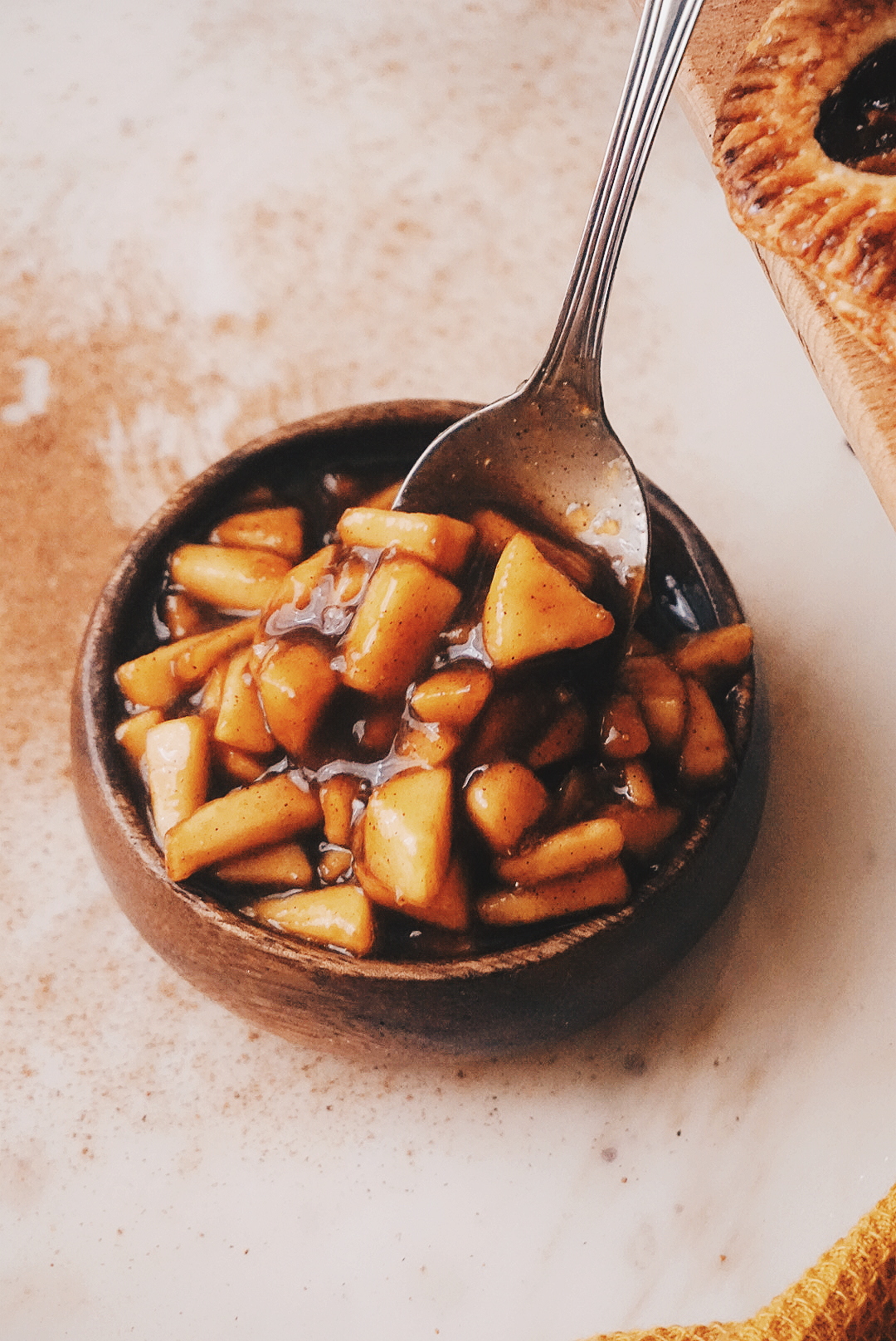 1. Numa panela junte o açúcar a canela e ½ de água e deixe dissolver em fogo médio. Quando ferver junte o amido (dissolvido em 3 colheres de sopa de água). Mexa vigorosamente e junte as maçãs. Reserve.