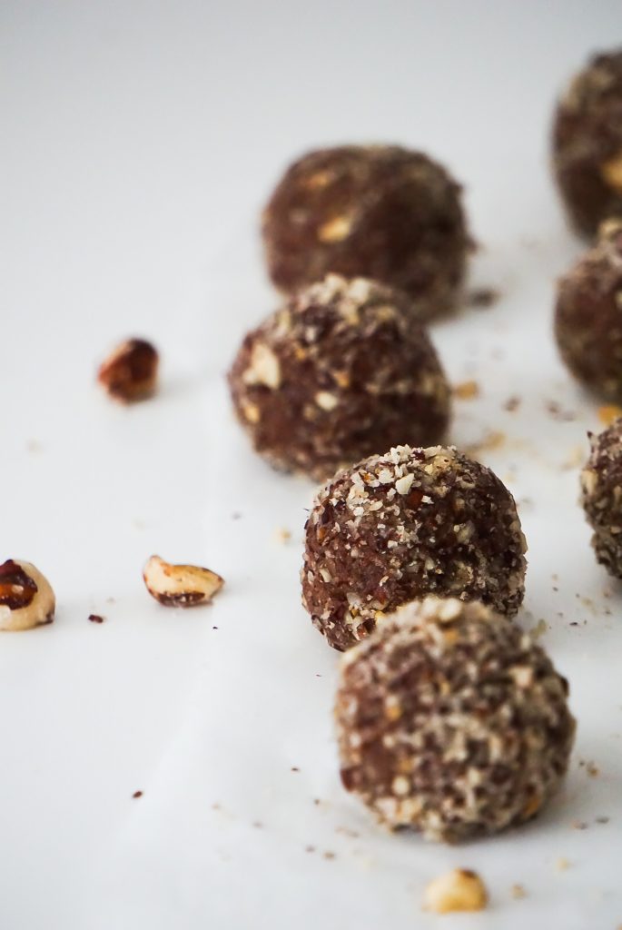 5. Com a ganache bem firme faz pequenas bolas e coloca uma avelã inteira no meio de cada uma. Passa as bolas nas avelãs trituradas. Continua este processo até teres 12 trufas prontas!